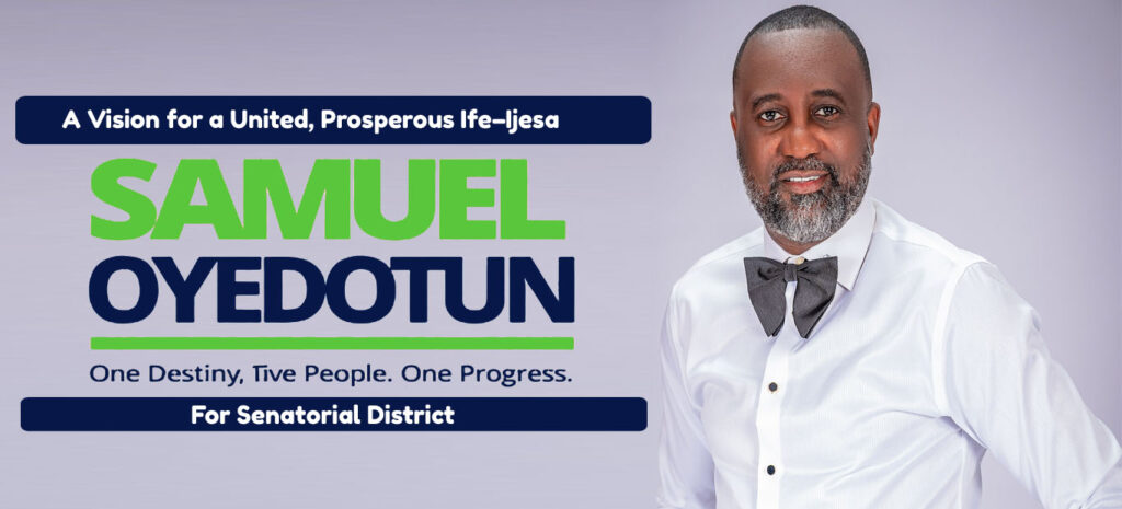 Hon. Olayinka Samuel Oyedotun is committed to building a stronger, healthier, and more united ife-ijesa Osun east senatorial district. His agenda focuses on healthcare, youth empowerment, rural development, education, infrastructure development, economic opportunities, and transparent governance—ensuring that every community is included, every voice is heard, and every citizen benefits from meaningful, people-centered progress.
